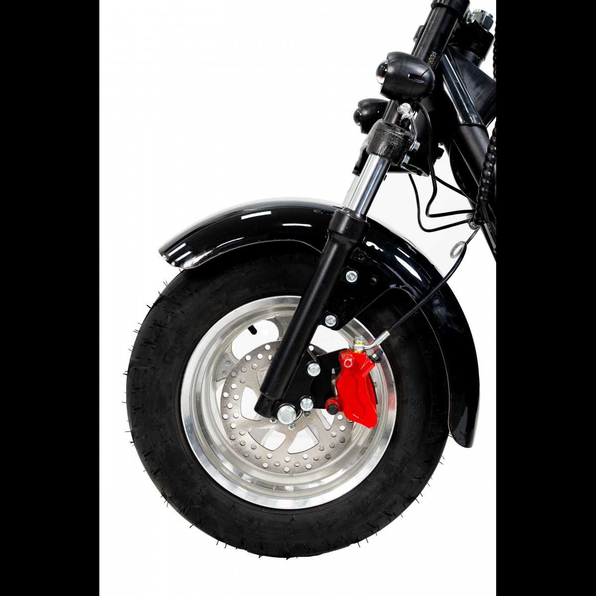 18-ти дюймові колеса з широкими шинами, подвійна вилка, вертикальні задні амортизатори та дискові гідравлічні гальма -