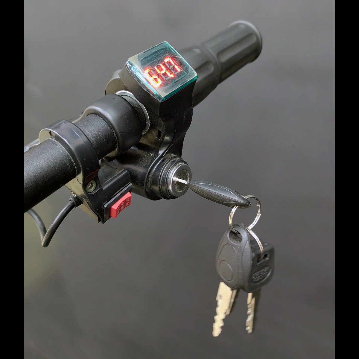 - ручка газу з вольтметром, який відображає заряд акумулятора електровелосипеда