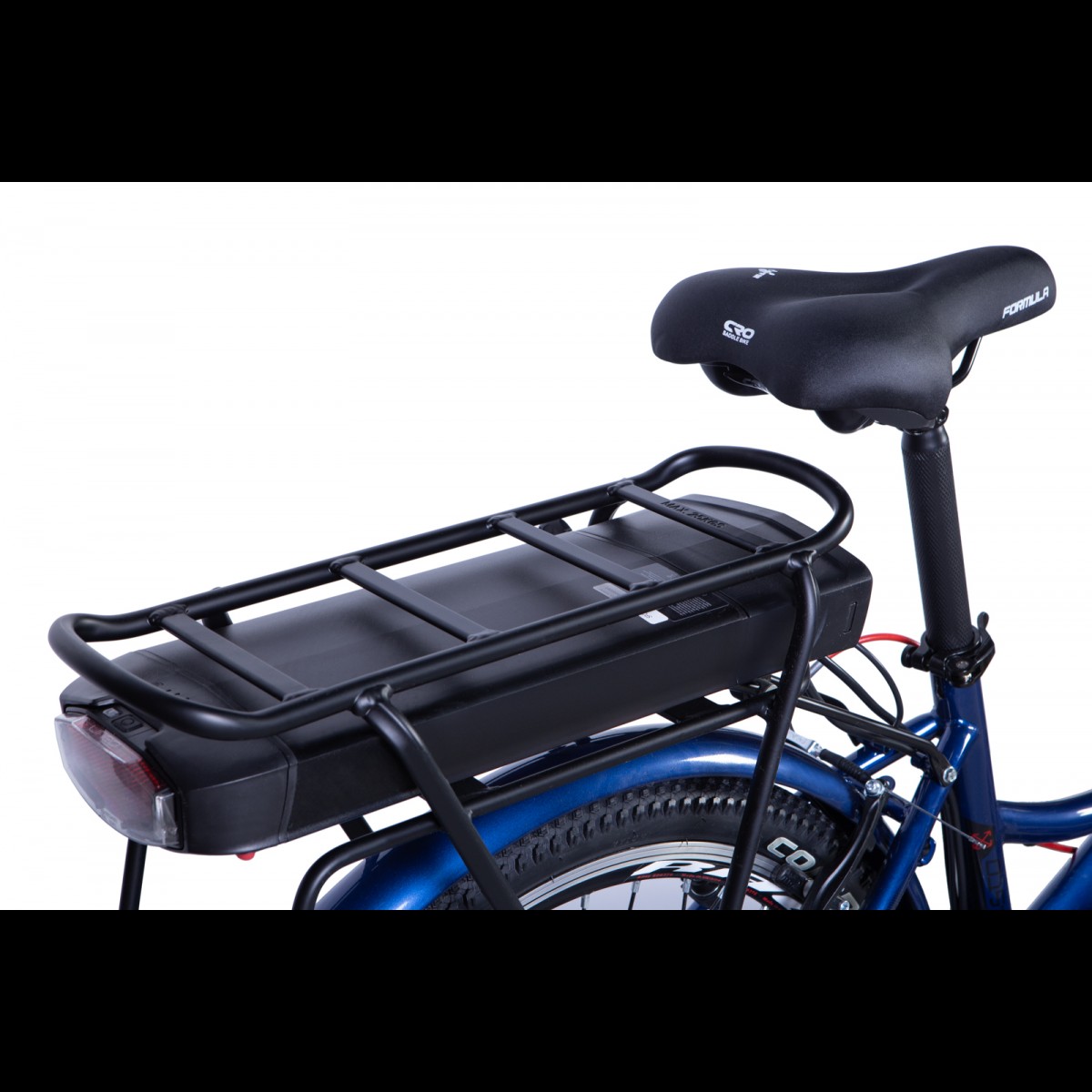 У рух електровелосипед приводить електродвигун потужністю 500Вт і літій-іонний акумулятор 36V 12,5Аh, який захований в спеціальному кейсі на багажнику, також завжди можна скористатися педалями.