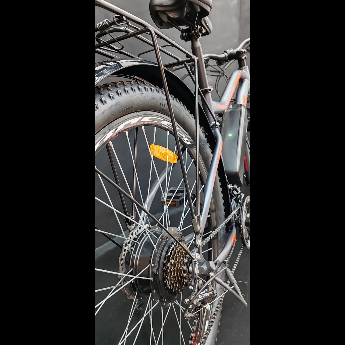 Акумулятор закріплено в пластиковому кейсі на рамі електровелосипеда.