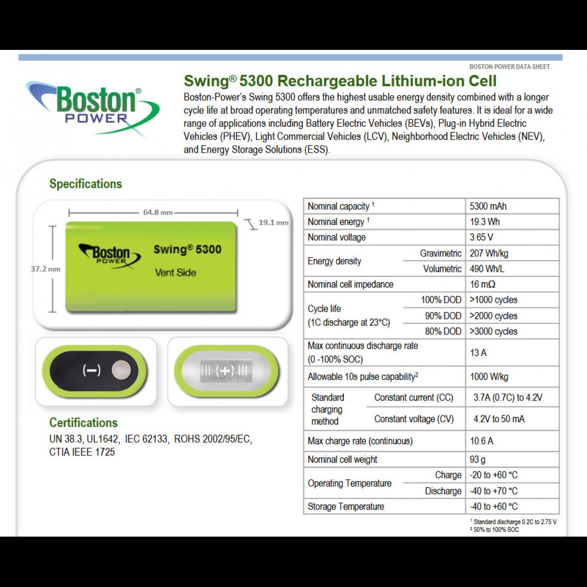 Елементи Boston Swing 5300 розроблені для електромобілів, тому адаптовані до більш жорстких умов експлуатації і володіють значно більшим терміном служби в порівнянні з більшістю аналогів в форм-факторі 18650.